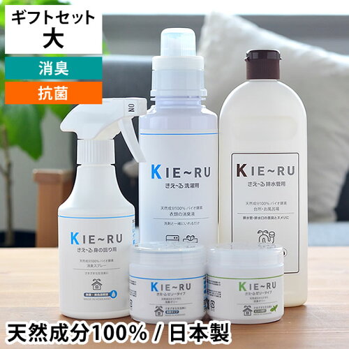商品名 KIE〜RU ギフトセット 大 商品詳細 サイズ 【スプレー】約 W80×H180×D65mm 【置き型ゼリー】約 Φ65×H62mm 【洗濯用】約 Φ70×H250mm 【排水管用】約 W78×H228×D40mm 内容量 【スプレー】約 300ml×1 【置き型ゼリー】各約140g(無香料・ミントの香り×各1) 【洗濯用】約 600ml 【排水管用】約 500ml 成分 【スプレー】バイオAW(活性水・酵素) 【置き型ゼリー:無香】バイオAW(活性水・酵素)、吸水ポリマー 【置き型ゼリー:ミント】バイオAW(活性水・酵素)、吸水ポリマー、ミント油 【洗濯用】バイオAW(活性水・酵素) 【排水管用】バイオAW(活性水・酵素) 液性 弱アルカリ性 使用方法 【スプレー】 ・ノズル部分OFFからONへ回してご使用ください。