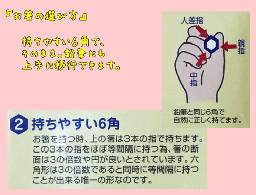 【持ちやすい6角】お箸を持つ時、上のはしは3本の指で持ちます。